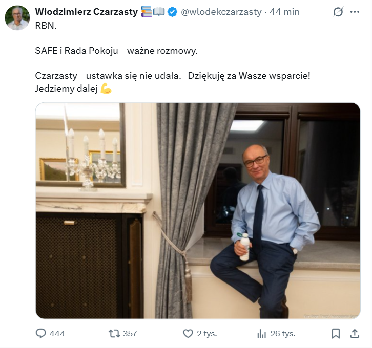Dwa pałace przerzucają się odpowiedzialnością za decyzję o dołączeniu do Rady Pokoju. Procedura wymaga zgody rządu (dziś premier Tusk ogłosił, że Polska nie przystąpi do Rady działającej na obecnych zasadach, ale nie wykluczył członkostwa w przyszłości), ale zdaniem MSZ inicjatywa leży po stronie prezydenta, który to zaproszenie otrzymał. Nawrocki nie wystosował jednak formalnego wniosku o poparcie inicjatywy.